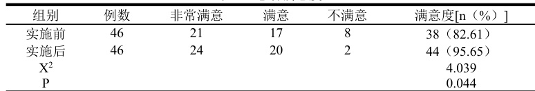 实施后患者满意度明显高于实施前( (P<0.05), )。见表 2。