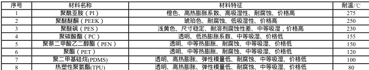 喷墨直写打印是目前最常用的 2D 直写制造技术方案[6],通过控制系统将喷嘴中的导电墨水通过相应的方式形成小液滴挤出喷嘴,随着喷嘴的移动从而打印出连续的导电线路。此种工艺中,基板芯层为已制备完成的商业成品[7-9],如 PI、PET、PEN、PDMS、TPU、PEEK、PES、PC 等热塑性绝缘介质[10],如下表 1 所示。而导电墨水包括溶液基导电油墨(银基墨水、铜基墨水、石墨烯基墨水等)、导电浆料(银基导电胶、铜基导电胶、金基导电胶)和液态金属(Ga/In/Sn 合金、共晶镓铟合金、Cr/Au 合金等) [11-13]。打印完成后,需要将墨水中的溶剂烘干或自然蒸发才能得到最终的导电线路,有时还需要通过进一步的工艺过程使油墨固化或者烧结,如通过加热或者激光的方式等。喷墨打印的精度由喷嘴所形成的液滴大小决定,常见的喷墨打印设备可以做到 50~100μm 的线宽,也有报道更高精度的喷墨打印设备可以打印宽度5μm 的导电线路[14]。