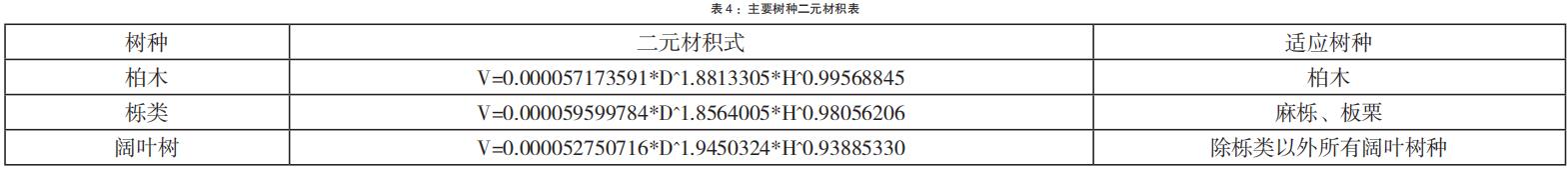 根据标准地调查的平均胸径、平均高和二元立木材积计算公式(表4),分别径阶计算样地蓄积量,并用加权平均法计算小班平均树高、平均胸径、郁闭度、每公顷株数、每公顷蓄积。