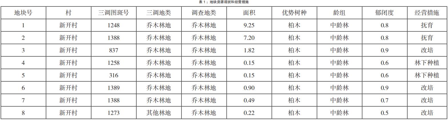 经调查,实施范围内共涉及8个地块,全部为乔木林地,优势树种全部为柏木,年龄23年左右,零星分布少量楝树、构树,根据项目区初步拟定建设内容,以及地块资源状况和不同位置,确定经营措施,详见下表: