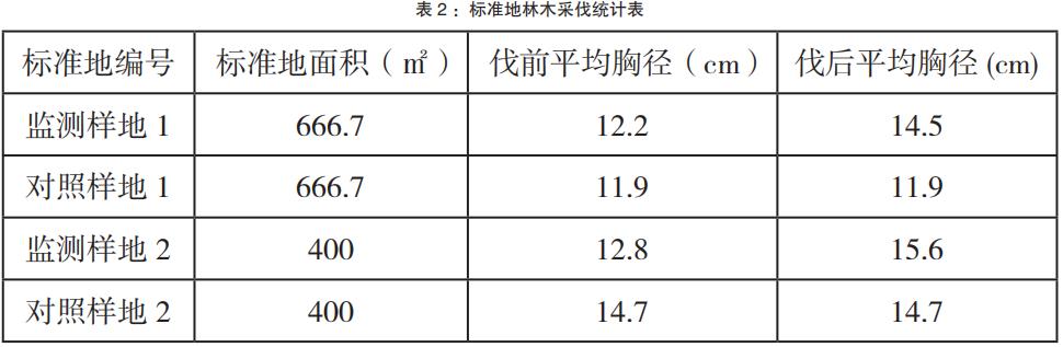 根据地块情况,共设置标准地4个,分别作为抚育监测样地和抚育对照样地,其中,两个标准地为666.67平方米,另两个为400平方米。标准地总面积2133.3平方米,调查检尺木共381株,对所有林木进行了分类分级,最终确定保留木189株、采伐木192株。