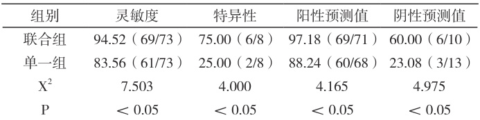 表2 两组灵敏度、特异性、阳性预测值、阴性预测值比较 1% )