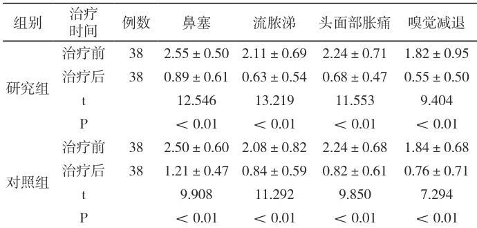 研究组:在对照组基础上联合清香利窍颗粒(一日一剂,一日三次)冲服,连续用药7 天。组方:金银花 15 克、黄芩 15 克、连翘 15 克、苍耳子 15 克、辛夷 10 克、白芷 10 克、藿香 12 克、石菖蒲 12 克、桔梗6 克。根据患者具体病情进行加减化裁。