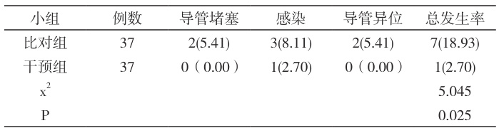 干预组不良事件发生率 2.70% 低于比对组的 8.93% , ΔP<0.05 。见表 1