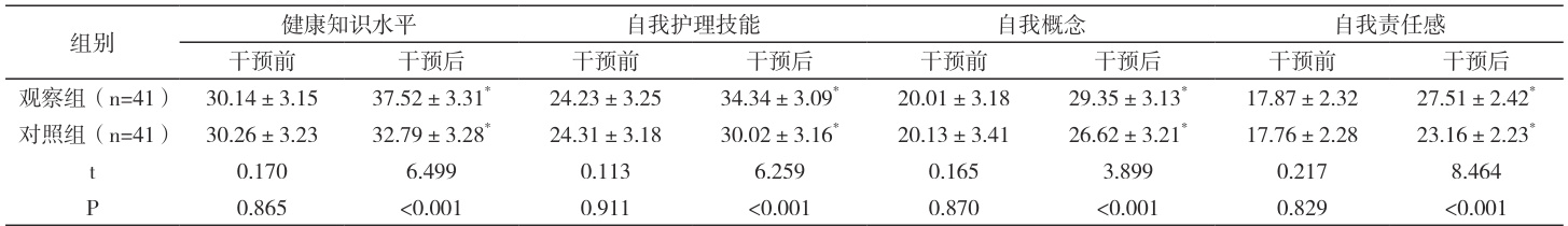 注:与同组干预前对比, ∘P<0.05∘ 2.2 自我护理能力