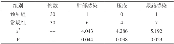 预见组患者肺部感染、压疮以及尿路感染发生率均低于常规组,P<0.05. 。如表 1 可见。