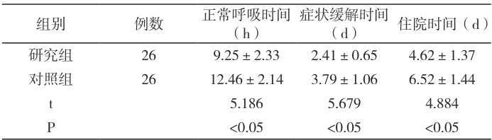 表1 两组正常呼吸时间、症状缓解时间、住院时间比较(