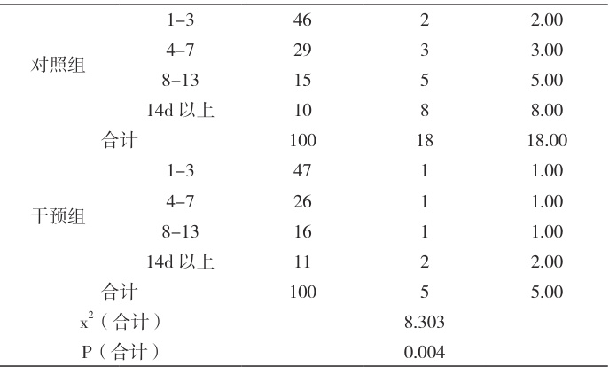 留置时间越长感染率越高,干预组干预后感染率减少( P<0.05 ),详见表1。