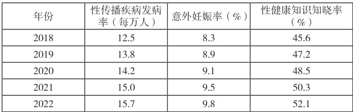 表中数据显示性健康知识知晓率虽有提高但性传播疾病发病与意外妊娠情况依旧每年都在上升,这表明性健康教育迫在眉睫且非常必要,所以把性健康教育纳入高校课程体系既能保障大学生个人健康又是给社会未来发展做重要投入。