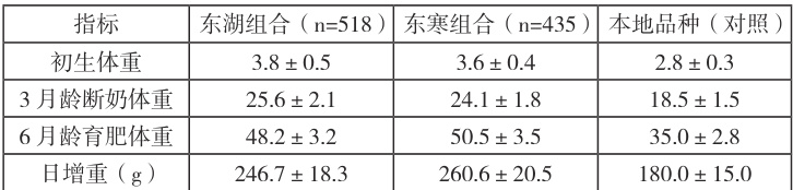 体重增长:从表 2 可见,东湖组合和东寒组合的 F1 代在各生长阶段的体重均显著高于本地品种( P<0.05 )。东湖组合的初生体重、3 月龄断奶体重、6 月龄育肥体重分别为 3.8kg 、25.6kg 、 48.2kg ,东寒组合分别为 3.6kg 、 24.1kg 、 50.5kg⨀ 。其中,6 月龄体重东寒组合显著高于东湖组合( P<0.05 ),表明东寒组合后期生长优势更明显。