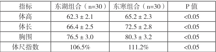 6 月龄 F1 代的体尺测定结果显示(表 3),东寒组合的体高( 65.2cm )、体长 (72.5cm) )、胸围( 80.3cm )均大于东湖组合,体尺指数( 111.2% )显著高于东湖组合( 106.5% )( P<0.05 ),表明东寒组合体型更为高大,躯体更长,有利于产肉性能提升。