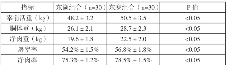 日增重:东湖组合和东寒组合的日均增重分别为 246.7g 和 260.6g,较本地品种( 180g )分别提高 37.1% 和 44.8% ,东寒组合日增重显著高于东湖组合( P<0.05 )。