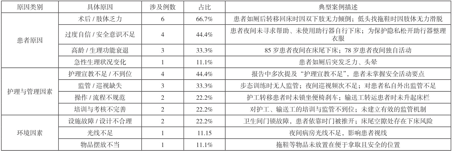将跌倒原因分为患者因素、护理与管理因素、环境因素三⼤类。具体构成及比例如下表 1 所示。分析表明,患者跌倒并非由单⼀原因导致,⽽是由患者内在风险、照护者⾏为、管理体系疏漏和环境隐患等多重因素交织作⽤的结果。其中,“术后肢体乏⼒”和“护理宣教不⾜”是出现频次最高的两⼤核⼼原因。