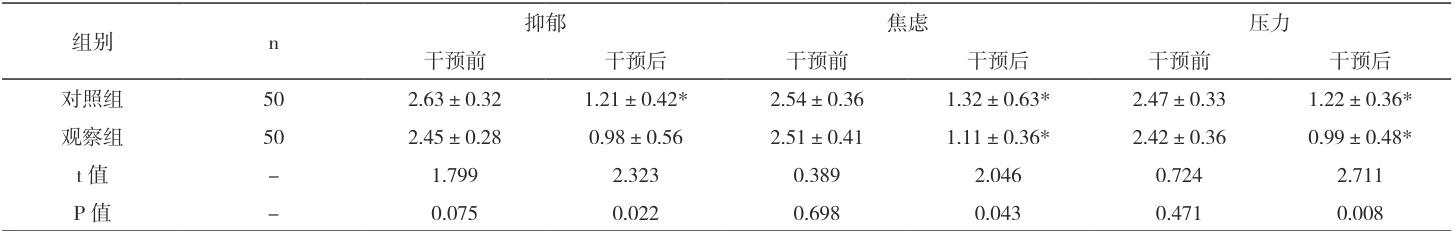 干预前,两组情绪评分对比( P>0.05 );干预后,观察组情绪评分变化显著低于对照组( P<0.05 ),见表1。