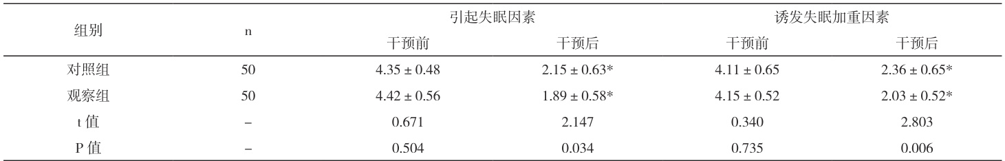 干预前,两组睡眠情况评分对比( P>0.05 );干预后,观察组睡眠评分明显低于对照组( P<0.05 ),详见表2。