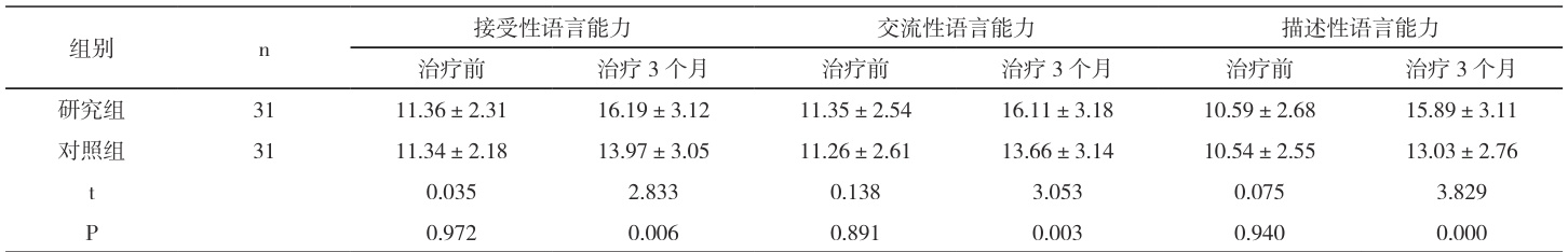研究对象选取为双流区中医医院收治的 62 例语言障碍儿童,家属均同意参与到此次研究中。将所有患儿随机分为对照组与研究组,每组 31 例,对照组中男患儿 19 例,女患儿 12 例,年龄 2-7 岁,包括语言发育迟缓及失语症状;研究组中男患儿18 例,女患儿13 例,年龄2-6岁,症状表现同于对照组。两组患儿的一般资料在统计学软件中进行分析显示差异均衡( P>0.05 ),具有可比性。