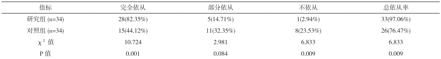 研究组患者总依从率显著高于对照组,( P<0.05 )见表 1.