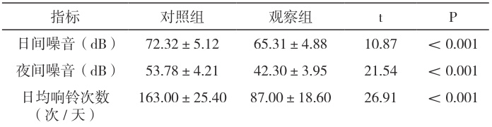 与对照组相比,观察组护士站的日间噪音、夜间噪音水平均显著降低,日均响铃次数也显著减少,差异均具有统计学意义( P<0.05 )。详见表3。