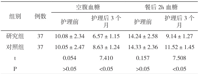 两组护理前空腹血糖及餐后 2h 血糖值差异均不明显( P>0.05 );护理后 3 个月则均形成了较明显的差异( P<0.05 ),研究组两项数值均更低。见表1。