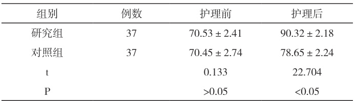 选择本院 2023 年 10 月 -2024 年 10 月收治的 2 型糖尿病患者,共计 74 例被纳入研究。采用随机数字表法分组,设置对照组和研究组两组,各分入患者37 例。对照组中,有男20 例,女17 例;年龄42-75 岁,平均( 59.35±2.47 岁);病程 2-8 年,平均( 5.15±1.46 )年。研究组中,有男19 例,女18 例;年龄40-76 岁,平均( 59.44±2.31 岁);病程 2-8 年,平均( 5.23±1.24 )年。对组间上述资料行差异分析,均显示 P>0.05 ,有可比性。