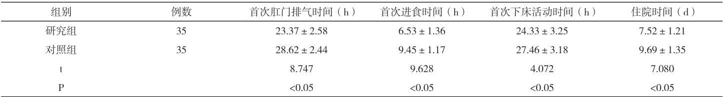 (1)术后康复指标:包括首次肛门排气时间、首次进食时间、首次下床活动时间及住院时间。(2)术后并发症发生情况。