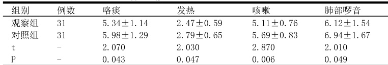 对照组使用常规疗法治疗,具体方法:(1)根据患者的具体症状采用相应的对症治疗措施,以减轻患者的不适感。(2)使用具有止咳化痰作用的药物进行治疗,以减轻呼吸道黏膜的刺激和炎症反应。(3)选用合适的抗菌或抗病毒药物进行治疗,以控制感染并防止病情进一步恶化。(4)补充体液,维持患者的水电解质平衡。(5)为患者提供充足的营养支持,包括蛋白质、维生素、矿物质等,以增强患者的免疫力,促进康复。
