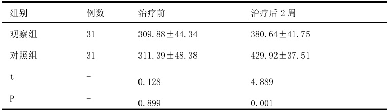 比较两组患者呼吸道感染症状消失时间。比较两组患者治疗前和治疗后 2 周的氧合指数(OI),正常范围为 400~500mmHg (1 mmHg=0.133 kPa. ),当 0I<300mmHg 则表示存在肺呼吸功能障碍。