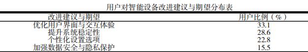 (1)针对用户界面与交互体验的优化,有33.1%的用户反馈指出,他们期望界面能够更加简洁直观,以便于快速理解和操作,同时他们也希望交互流程能够更加顺畅,减少操作中的困惑和等待时间。(2)关于提升系统稳定性的问题,28.6%的用户表示,他们偶尔会遇到系统故障或延迟,这影响了他们的使用体验,因此他们强烈希望开发者能够加强系统的稳定性,确保应用能够更加稳定地运行。(3)在个性化设置选项方面,22.8%的用户表示,他们期待系统能够提供更多的个性化设置选项,这样可以更好地满足不同家庭成员的特定需求,使每个人都能找到最适合自己的使用方式。(4)加强数据安全与隐私保护也是用户关注的焦点,有15.5%的用户对数据安全表示了关切,他们希望开发者能够加强数据加密和隐私保护措施,确保他们的个人信息和数据安全得到充分的保障。
