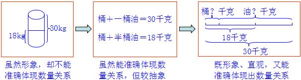 发现:第二个图示对于六年级的孩子很容易理解,可对于四年级孩子来说却非常抽象。于是我想到了线段图示,