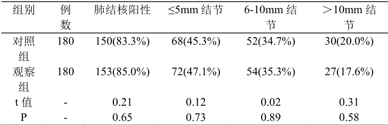 低剂量 CT 组与常规剂量 CT 组的肺结核检出率近似 (P>0.05) 。两者间对≤5mm 微小结节的检出率无显著统计学意义 (P>0.05) 。见表1: