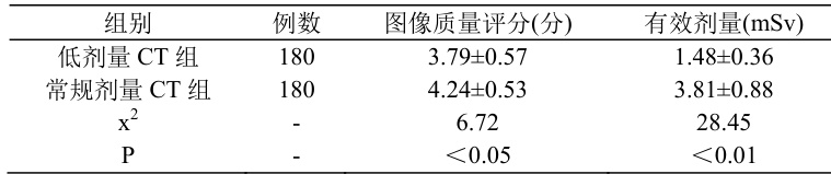 低剂量CT 组图像质量偏低( P<0.05) ),但均能在诊断要求以上( ≥3 分)。低剂量CT 组辐射剂量显著更低 (P<0.05) 。数据对比结果详见表3:
