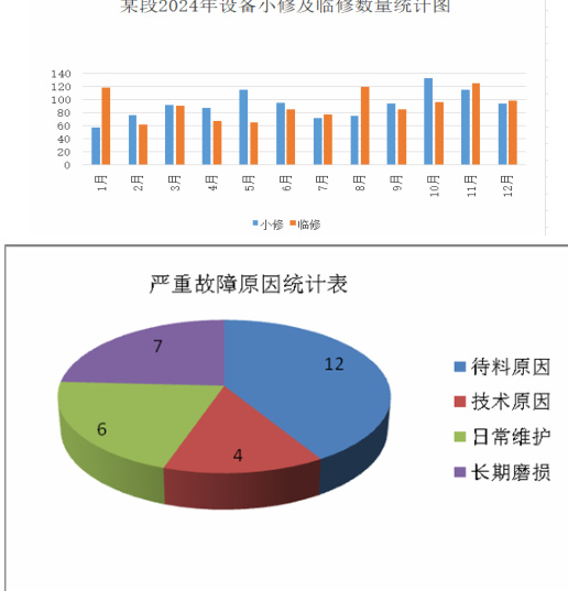目前各车辆段设备主流检修模式为计划预防修为主,故障临修为辅的检修模式。该检修模式是依托EMIS 系统(车辆设备管理信息系统),根据设备基础数据设定检修周期,自动生成年度、月度检修计划。以某车辆段为例,2024 年全年检修计划为 1035 台,临修故障处置 1088台,故障严重影响生产的有29 起,从下图中可以反映出临修故障数量与小修数量基本持平,月度小修质量较差。其中,经分析影响生产的严重故障主要集中在不落轮镟镟床、空调机组性能试验台、DC600V 地面电源、构架抛丸除锈机等设备,影响生产的主要原因为日常保养不善导致设备长期磨损以及待料原因导致设备停机。经分析,出现上述问题主要原因有以下几个方面。