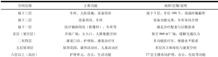深圳市民政康复中心A院区面临核心区用地紧张、空间局促的现实状况,通过立体空间开发来最大化释放建筑使用功能和公共活动空间,地下三层进行整体复合利用,除了提供 180 个机动车停车位之外,还整合设置医疗辅助、设备用房以及战时人防掩蔽空间,充分挖掘了地下资源,地面部分首层大面积架空形成开放广场,保障人群的通达与集散,同时缓解地铁站与梅林路周边的交通压力,裙房四层与塔楼采用架空设计延伸出立体屋顶花园系统,形成多功能康养、休闲与儿童活动空间,打破传统医疗建筑平面化空间组织的限制,高层主楼集中布局护理单元实现垂直整合,让功能区实现高效叠加[3]。(如表,如图)