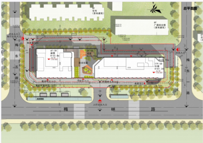 深圳市民政康复中心A院区坐落在福田区核心片区,其具体位置处于梅林路 26 号,周边城市开发强度特别高且土地利用很紧张。这个项目的用地面积仅仅只有7141.99 平方米,整体呈现出东西向狭长的不规则形态,东西长度大约为145 米,南北宽度最窄的地方仅有23 米,最宽处也不过34 米。由于受到地块红线、规划退线以及周边老旧建筑日照等因素的影响,实际可以进行建设的范围十分局促。面对土地资源高度紧缺以及不规则用地形态的状况,项目采用体块切割、功能有序分区与立体空间开发的方式,实现了空间的高效利用和功能的合理布局,满足了高密度城区内康复医疗设施的建设需求。