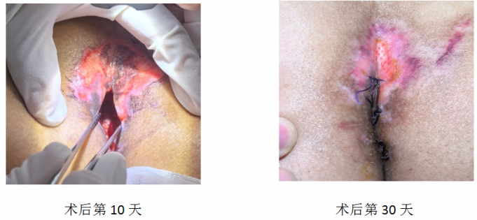 患者男,51 岁,1 年前无明显诱因出现骶尾部肿痛,皮肤破溃,无发热,轻度压痛,无消瘦乏力等。本人未予重视,自行采用碘伏消毒清创处理,表皮间歇性修复,1 到 2 周后复发,如此往复一年,经久不愈,来单位门诊部就诊,门诊部查体见局部膨隆,轻度红肿,皮肤破溃针孔大小,伴有脓性分泌物渗出,疑为藏毛窦感染,为进一步明确诊断,转诊至上级医院伤口门诊,经检查,患者尾部偏上处局部红肿,轻微压痛,伴皮下脓肿形成,初步排除藏毛窦,予以刀片挑破皮肤后,排脓处理,归队后嘱每天排脓引流,换药清创处理。经门诊长期换药,窦道逐渐缩窄,28 天后无分泌物渗出,伤口闭合,局部轻度压痛。患者自认完全愈合,长期久坐加之爱好骑行,1 周后复发,在外地基层医疗机构以“皮下脓肿行局部切开清创引流术”,术后继续每日换药引流排脓,但 30 余天后发现窦道底部愈合缓慢,管腔逐步缩窄,且脓性分泌物未见明显减少,患者锻炼后伴少量血性分泌物渗出,再行转诊至体系医院进一步明确诊断,经局部超声确诊为藏毛窦感染,当日收治入院后行皮瓣转移 + 藏毛囊肿切除术,切除大小约4x4cm 组织,皮肤行椭圆形切口切开,术后予以常规清创、生肌等伤口护理,二期缝合,术后25 天缝合伤口,术后40 天拆线,患者痊愈恢复正常。术后病理发现 1 根毛发,周围炎细胞浸润,多核巨细胞反应和肉芽组织形成。