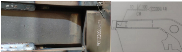本文涉及的构架是公司自主研发、具有完全自主知识产权的地铁转向架,其构架采用H型箱体结构,整个转向架结构合理、工艺性好,能满足不同客户的特定需求,从而使用范围较为广泛。该型号构架的侧梁外体长焊缝大部分由机械手焊接完成。而在侧梁端头部分的U型焊缝,由于该焊缝由上下盖板和端部封板组成的U型焊缝,板厚 10mm ,坡口角度 50∘ ,工艺要求焊缝坡口需填满且熔深需满足 9mm ,焊角高度K为 6-8mm ,所以其结构的局限性及工艺要求的规范性,使机械手摆动幅度、焊接可达性受到限制,如图1、图2 所示,故此U型焊接结构需采用人工灵活性施焊。然而,在人工焊接过程中,规律性的焊缝成型不良,使得焊缝质量无法得到有效保证,其焊缝成型不良问题主要表现在焊缝波纹粗劣、不均匀不整齐、与母材不圆滑过渡、焊接接头差、焊缝高低不平等及下趴等焊缝质量问题。焊缝焊角有效值低于工艺要求标准,形成了惯性质量问题,焊接交验合格率较低,如图3 所示。