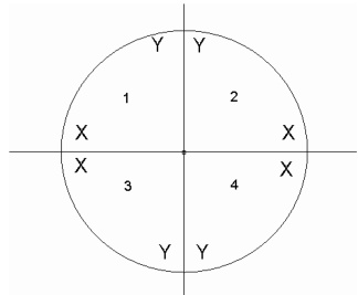 两件 1/4 半齿轮把合后的 1/2 半齿轮的 X 标记面都加工好后,再在由序号1,2 两件1/4 半齿轮把合成的1/2 半齿轮的X 标记面上划与由序号3,4 两件1/4 半齿轮把合成的1/2 半齿轮的把合孔及销孔加工线,并按Y 标记面把合孔及销孔的尺寸进行加工,然后用已加工好的X 标记面上的把合孔及销号划序号 3,4 两件 1/4 半齿轮把合成的 1/2 半齿轮的把合孔及销孔加工线,并按前面的尺寸加工好。
