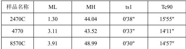 从表 2 可以看出 8570 的交联密度最大,2470 的加工性能最好,4770的硫化速率最快。