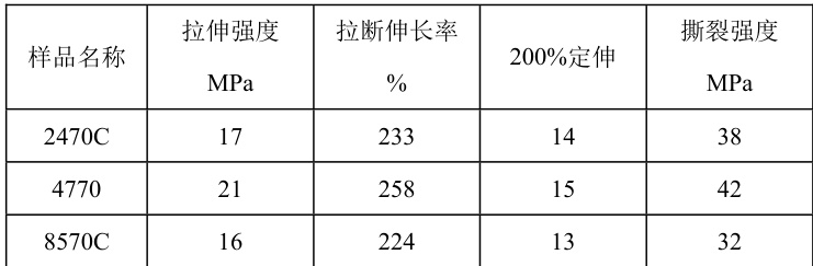 从以上实验数据综合来看,8550C的交联密度是三者最强的,理论上其机械性能应该是最大的,但是其拉伸强度和撕裂强度却不是最强的。三个产品的乙烯含量相近,但是其熔融焓差别较大,熔融焓较大的产品其拉伸性能和撕裂性能都比较大,因此从这组数据来看结晶对机械性能的影响比交联对机械性能的影响要大一些。