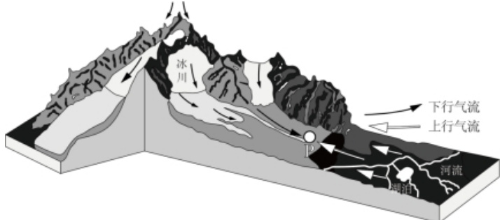 【例题:2024 年广东卷第 13 题】下图为珠穆朗玛峰南坡某冰川区暖季上、下气流运动状况示意图。据此完成下面小题。