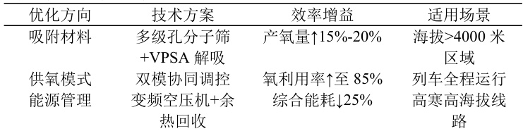 3.系统设计与集成缺陷。供氧模式效率差异,弥散式供氧(浓度23.5%625% )能耗低但提升有限;分布式供氧(浓度 40%45% )需更高能耗,两者未优化协同会导致整体效率下降。电气系统可靠性,高原环境下电器绝缘强度需提升 1.5 倍以上,否则电路击穿风险增加;未配置防雷系统(如浪涌吸收装置)可能引发设备宕机。空间与维护约束,紧凑车厢空间限制大型制氧设备部署;高粉尘环境使过滤器堵塞周期缩短 50% ,维护不及时将直接降低产氧纯度,关键因素总结如表1。