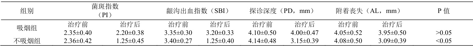 表1:吸烟与不吸烟牙周炎患者治疗前后临床指标对比