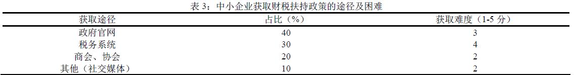 在获取政策信息的途径方面,中小企业通常通过政府官网、税务系统、商会和行业协会等渠道。根据调查数据,约 40%的企业主要通过政府官网了解政策信息,30%的企业依靠税务系统,另有 20%的企业通过商会和行业协会获得相关政策信息。此外,还有 10%的企业从社交媒体等其他途径获取政策信息(见表 3)。然而,偏远地区的小微企业反映,由于信息获取渠道相对有限,政策的及时性和可得性较低,导致其对政策的知晓度和实际受惠度均较低。
