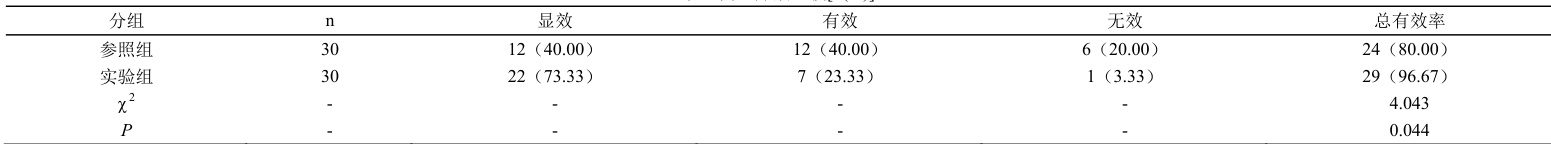 如表1 所示,实验组疗效更好,总有效率较参照组明显更高( P<0.05 )。