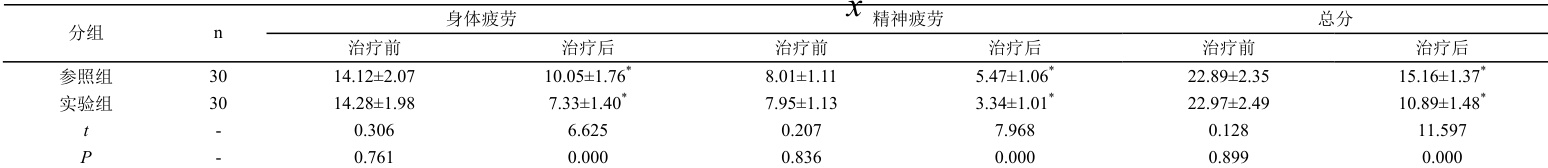 如表 2 所示,两组疲劳度治疗后均减轻(P<0.05),同时实验组疲劳度减轻更为显著, 其身体疲劳评分、精神疲劳评分及总分均较参照组明显更低(P<0.05)。