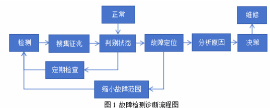 在智能矿山背景下,故障诊断技术的应用对于煤炭工业的升级具有不可忽视的意义。从概念角度进行分析,故障针对技术是指利用信息处理技术和计算机技术等先进技术,对发生故障的设备以及工作区域进行诊断的方式。以高压异步电动机为例,其故障状况检测与诊断的流程如图1 所示。按照图中流程所示,故障诊断技术能够按照规定的步骤要求,完成故障检测与确定任务,以帮助维修人员对设备进行精准修复。在高压电动机运行过程中,定子侧一旦出现电气故障问题,其装置就会发生放电连锁反应。而导致该故障问题的原因与电机绝缘剩余寿命之间存在密切关联。所以,工作人员应该根据实际情况加强对放电强度的检测。在发生定子绕组故障的时候,负责故障维修的人员应该对故障发生区域进行全面检查。一般情况下,该故障会造成定子电流高次谐波增加。通过相关实验与数据研究可以发现,匝间短路时定子电流 17、11、5 次谐波明显增加,其中 5 次谐波增加的程度最为明显。在对中性点短路时,故障检测对应的三相电流幅值分别为 1.07、0.89、0.91。由此可以看出,该种类型的故障会在电动机电流中产生零序电流、负序电流。因此,在使用故障诊断技术的时候,工作人员一定要关注技术与机电装置的适配性。