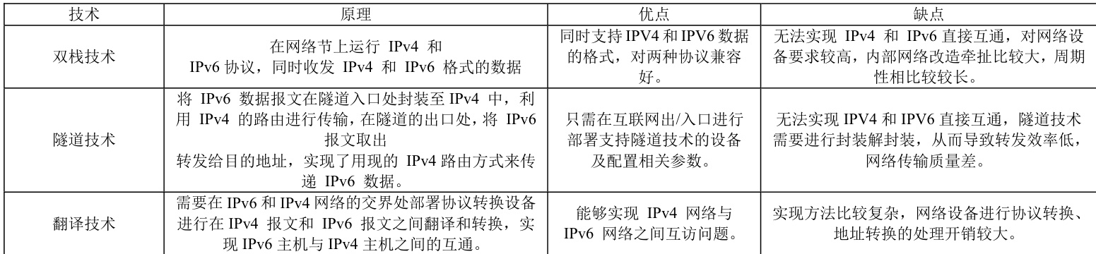 双栈技术的优点:概念清晰,易于理解 ,能够充分发挥IPv6 协议的优点。缺点:对网络节要求较高,牵涉到相关软硬件升级改造,投资大较大且建设周期长。