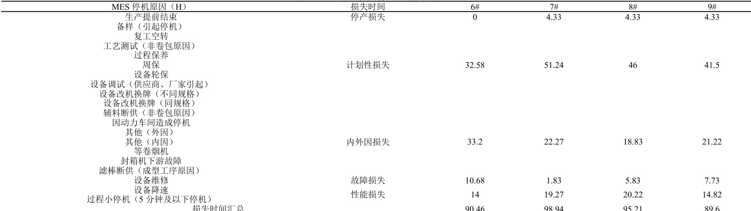 选取 MES 系统 2025 年 5 月卷包车间 6#-9#包装机台的数据作为研究对象,按照改进之后的定义和指标重新取数并计算,绘制出包装机台生产损失时间表和工况时间表,各类工况时间是由表 1 和卷包生产停机汇总计算得出,如下所示。