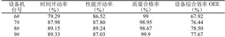 表 3 最后一列数据可以看出4 台包装机的 OEE 都在 85%以下,其中 6#最低为 67.92%,7#、9#、8#依次是 76.44% 、 77.67% 、 78.50% 。通过时间开动率、性能开动率和质量合格率的对比可以看出,6#包装机组时间开动率较低,为 79.29% ,是影响其设备综合效率 OEE 的主要原因。