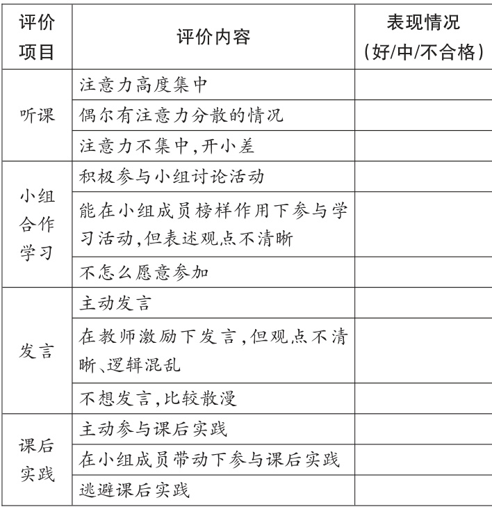 实施过程中,教师需诊断学生学习难点,立足个体生活经验差异,通过个性化指导强化学生主体地位。在议题式教学评价机制驱动下,教师通过尊重学生成长规律激发其学习内驱力,同步培养学生自主探究与协作学习能力,实现知识习得与核心素养发展的双向促进。议题式教学评价表格设计如表1所示。